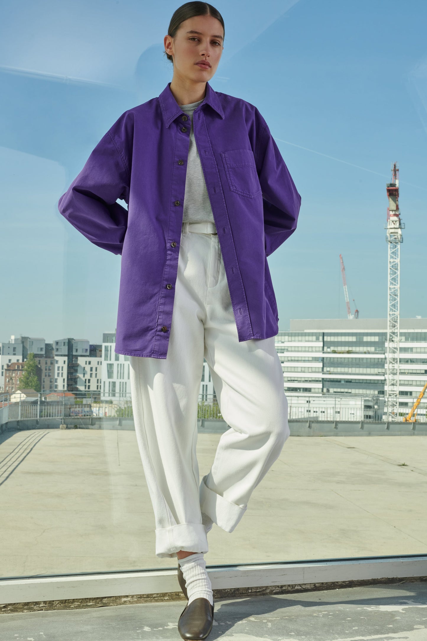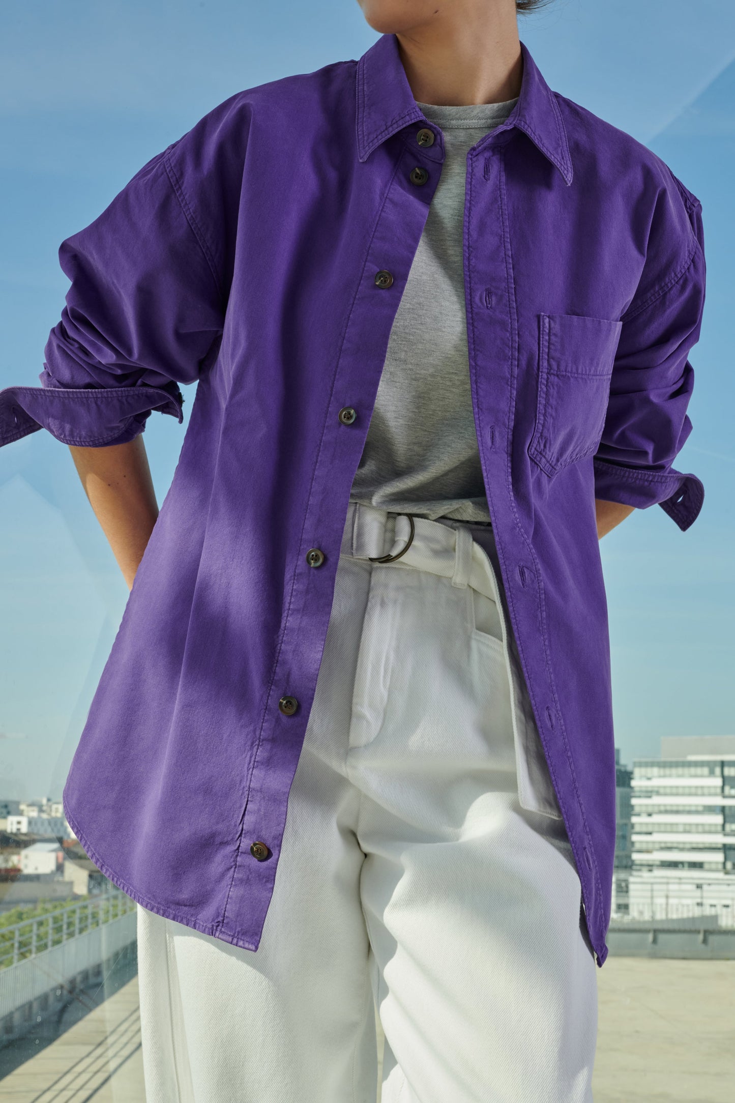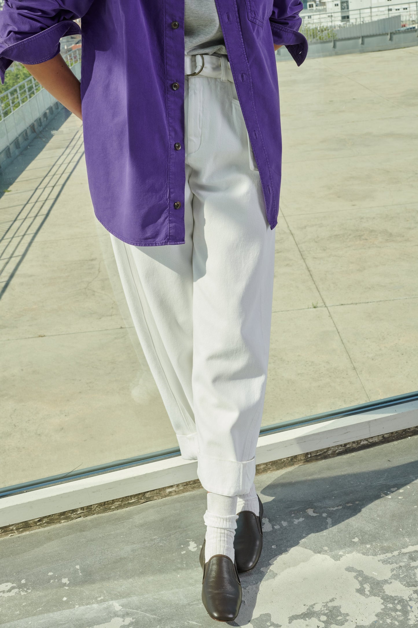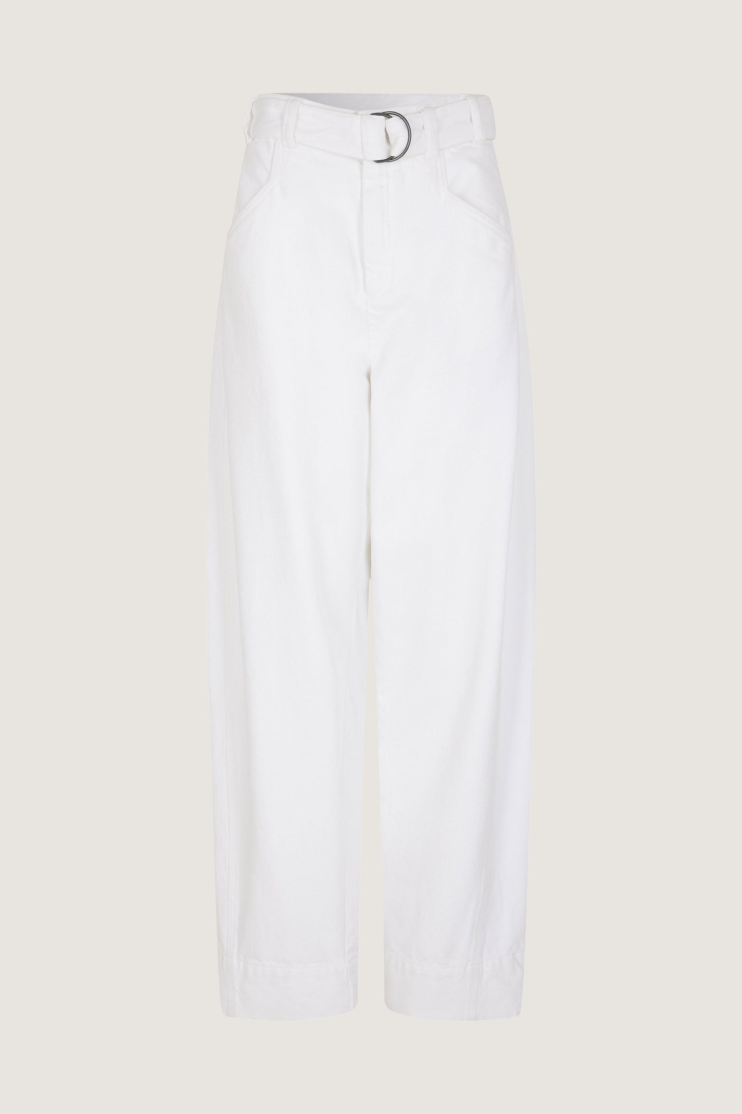 White denim high-waisted trousers - Slightly curved cut- Removable belt with double buckle- Two back patch pockets- Hook and loop fastener on the inside of the belt